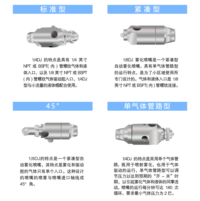 内置气缸控制“开/关”,每分钟可运行180次循环。每次“开/关”运行只切断喷雾器的液体部分。送到喷嘴的液体流可以通过虹吸或重力传送,也可通过压力传送。喷雾装置可选种类繁多,适用于各种流量和喷雾形状。二流体的共同特点:利用压缩空气高速流动的原理使液体变微粒化。