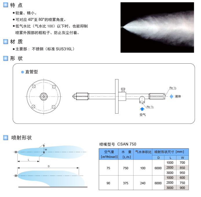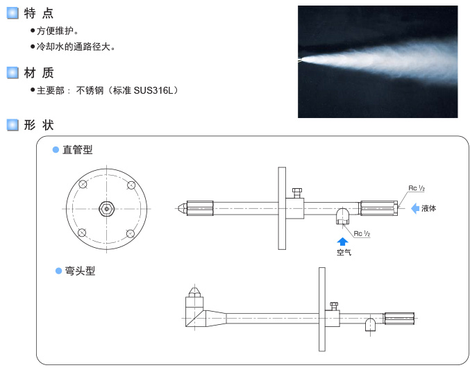 设计特点▶利用压缩空气与液体的撞击,产生非常均匀和细密的雾化效果,正常情况下平均的雾化颗粒直径到80微米以下。▶喷嘴整体由连接本体和喷雾装置组合而成,而喷雾装置由空气帽和液体帽组合而成。▶喷雾形状采用多孔实心锥型。▶连接喷嘴本体的称为雾化枪杆,一般根据工况采用316L材质。▶喷嘴连接雾化枪杆有两个独立的液体入口和空气入口。▶单支喷枪的流量大可达18L/Min,根据烟道的烟气量以及所降低温度计算出喷枪数量以及安装方式。通常情况下采取逆流喷出,根据不同的工况也可顺流喷射。