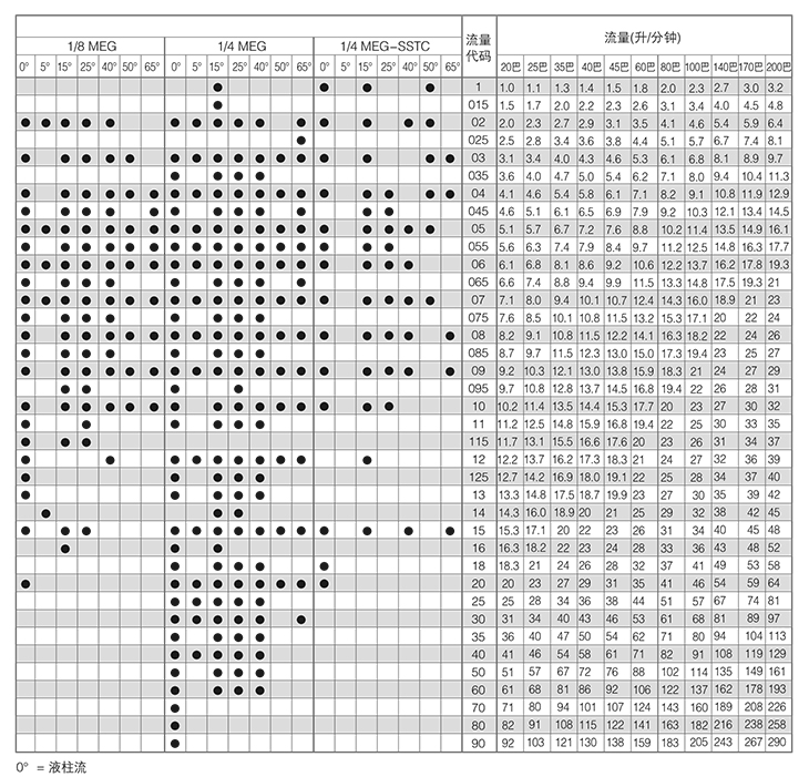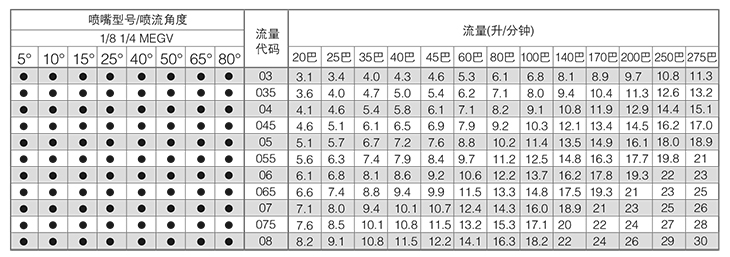 • MEG系列喷嘴具有特殊硬化的不锈钢结构,具有较长的耐磨损寿命和流量控制准确度。• MEG系列在高压力下能产生高冲击力的液柱流或扇形喷雾形状,液滴颗粒中等大小。• MEG系列使用内置导流叶片稳定紊流,实现均匀喷雾分布。• MEG系列喷孔是经精细工艺制成,可精确控制流率且喷嘴上带有凹槽以防损坏。• MEG系列喷嘴侧面有铣削出的平台,它与喷雾平面平行,对快速校准喷雾位置提供视觉参考。• MEG-SSTC-带有碳化钨喷孔嵌体,提供了更佳的耐磨性;喷射角度0º液柱流至65º。