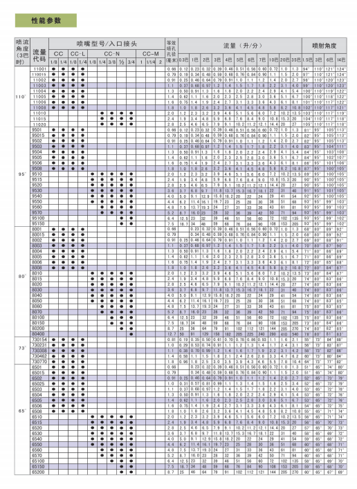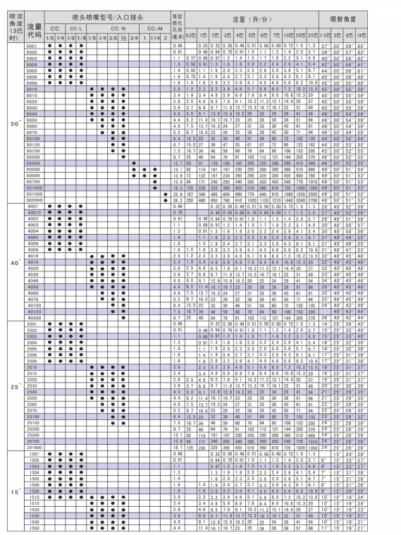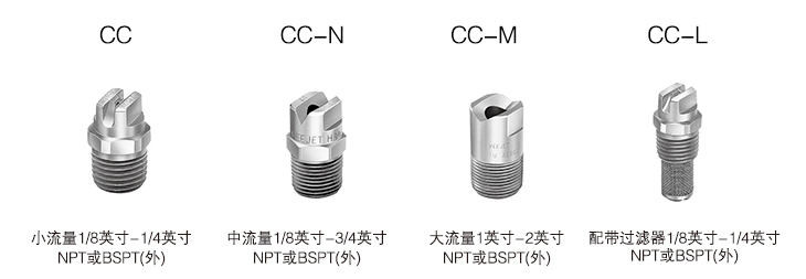CC扇形喷雾喷嘴的特点是能产生高冲力的液柱流或扇形喷雾,喷流角为0°-110°。这种喷嘴产生的喷雾分布均匀,液滴大小为小到中等。当需要若干个喷嘴产生重叠喷雾时,具有特色的逐渐变细的喷雾边使喷雾覆盖区分布均匀。CC和CC-L系列喷嘴在3巴压强下流率不到3.9升/分钟,具有外管道螺纹接头。CC-L系列喷嘴内装过滤器(在内管道螺纹接头时,没有过滤器)。CC-N和CC-M系列喷雾在3巴压强下,额定流率为3.9升/分钟或更大,并具有外管道螺纹接头。