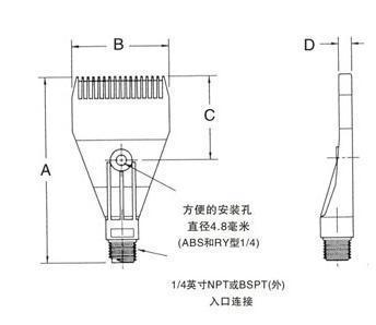 F型吹风喷嘴使用于1/4英寸BSPT外螺纹连接头,并设计有定位孔(ABS喷嘴 不锈钢喷嘴),便于喷嘴的并排安装,其形成的组合式风刀能产生有效的空气帘。